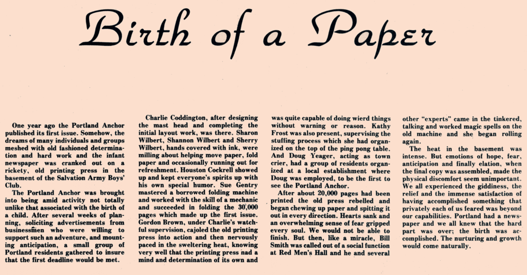“The Anchor, if it had not fully grown up, was at least no longer a baby. While a year ago people thought a Portland Anchor was something you throw out of a boat, after a year people were looking for each month’s edition with anticipation. Here at The Anchor, we know people have come to expect growth and news idea from the paper. So we’re promising that in year number two we will work just as hard to present an exciting, readable, and valuable paper to the people of Portland.”